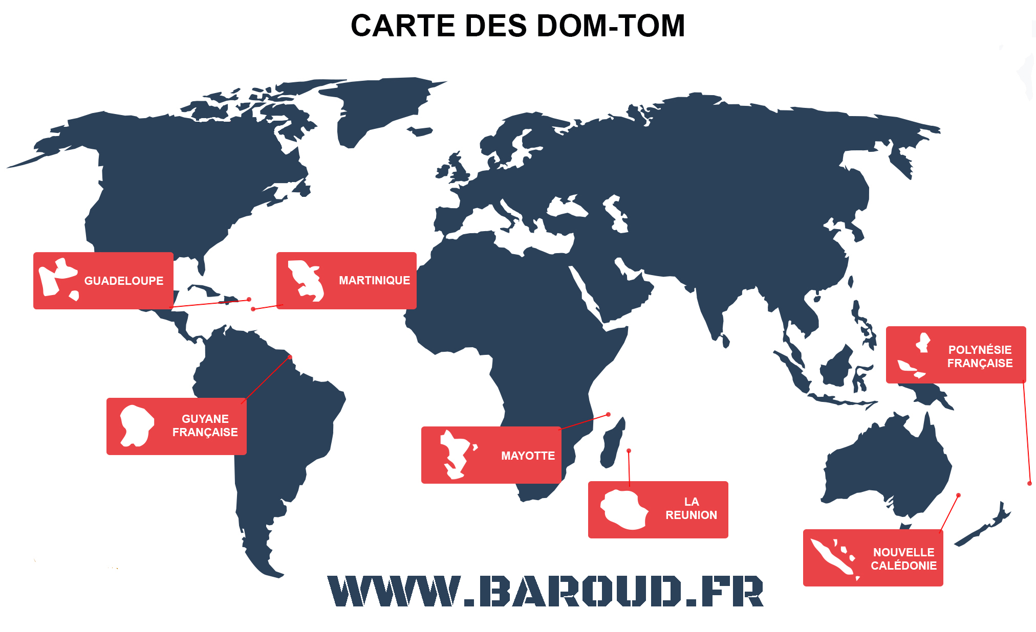 Guadeloupe, Guyane, Polynésie Française, Réunion, Martinique, Mayotte, Nouvelle Calédonie